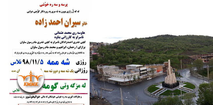 بر اساس گزارش جمعیت حقوق بشر کوردستان؛ شنبه ۵ بهمن ماه ۱۳۹٨ شمسی، نوعروسی به نام ” سیران احمد زاده ” اهل ساوان از توابع سردشت در شرق کوردستان با حلق آویز کردن، به زندگی خود پایان داد.