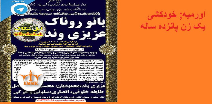 روز پنجشنبه 20 آذر 1399خورشیدی، یک شهروند با هویت “روناک عزیزی وندی” 15ساله فرزند مجید اهل روستای “کانی رش” در منطقه صومای برادوست از توابع اورمیه اقدام به خودکشی و به زندگی خود پایان داد.