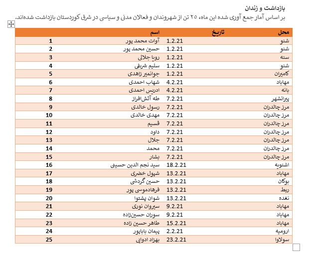 بر اساس آمار جمع آوری شدە این ماە، ٢٥ تن از شهروندان و فعالان مدنی و سیاسی در شرق کوردستان بازداشت شدەاند.