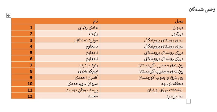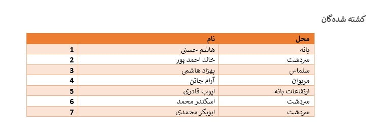 در این ماە ٤ تن در اثر انفجار مین کشتە و زخمی شدەاند. در این بین یک تن با نام نادر برادران کشتە شدە و سە تن دیگر زخمی شدەاند.