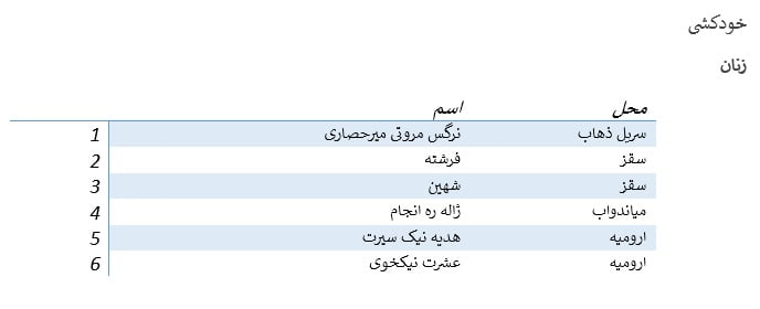 در این ماە جمع ١٢ تن خودکشی کردە و ٤ تن نیز کشتە شدەاند. از این جمع ٦ مرد و ٦ زن خودکشی کردە و ٢ مرد و ٢ زن نیز بە قتل رسیدەاند.