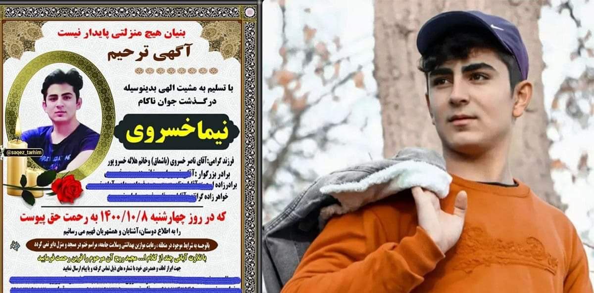 چهارشنبه ۸ دی۱۴۰۰ خورشیدی، یک جوان با هویت “نیما خسروی” ۱۸ ساله فرزند ناصر اهل سقز با حلق آویز کردن، اقدام به خودکشی و به زندگی خود پایان داد.