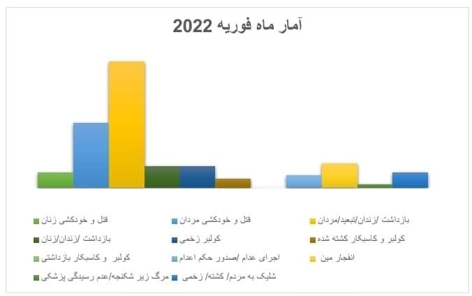 درصد خودکشی شهروندان مداوما رو به افزایش است. در این ماه شاهد خودکشی و کشتار شهروندان مخصوصاً در بین قشر نوجوانان و زنان بوده ایم. آمار خودکشی و قتل در این ماه ۲۶ تن گزارش شده است که در این بین ۱۵ شهروند خودکشی کرده و ۱۱ تن دیگر به قتل رسیدهاند.