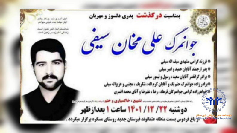 براساس گزارشهای دریافتی، یکشنبه ۲۱ اسفندماه ۱۴۰۱ خورشیدی، حکم اعدام یک زندانی با هویت علی مخانسیفی اهل روستای مسگره از توابع کرماشان در زندان دیزلآباد حکومت ایران به اجرا درامد.