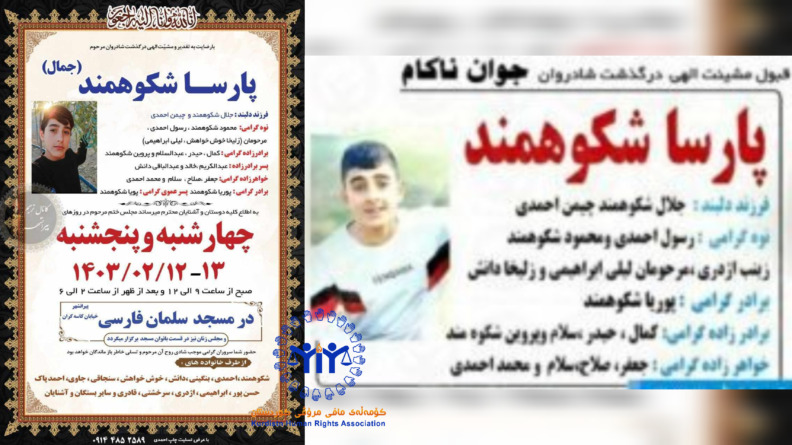 بر اساس گزارش های دریافتی به مرکز خبری KMMK، شنبه ۱۵ اردیبهشت ۱۴۰۳ خورشیدی ئارێز رشیدی متاهل و دارای یک فرزند اهل روستای دزاور و ساکن مریوان از طریق حلق آویز کردن و پارسا شکوهمند نوجوان ۱۶ ساله اهل پیرانشار با مصرف دارو اقدام به خودکشی کرده و به زندگی خود پایان دادند.