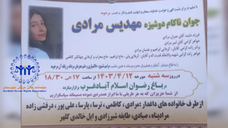 بنا بە گزارشهای رسیدە بە مرکز خبری KMMK، دوشنبه ۱۱ تیرماه ۱٤۰۳ خورشیدی، مهدیس مرادی شهروند جوان اهل شاباد(اسلام آبادغرب) علی رغم تلاش مردم، با اقدام به خودکشی از طریق سقوط از ساختمان به زندگی خود پایان داد.