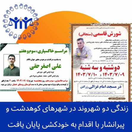 بنا بە گزارش‌های رسیدە بە مرکز خبری KMMK، پنجشنبە ۵ مهرماە و یکشنبە ٨ مهر ماە ۱٤۰۳ خورشیدی، زندگی دو شهروند با اسامی “علی‌اصغر حقی” اهل کوهدشت و “شوڕش قاسمی” اهل پیرانشار، در پی اقدام به خودکشی پایان یافت.