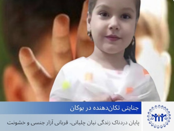 بر اساس گزارشات رسیده به مرکز خبری جمعیت حقوق بشر کوردستان، در یک رویداد هولناک که جامعه را به شدت تحت تأثیر قرار داده است، نیان چلبیانی دختر ۷ سالهای که قربانی آزار جنسی و خشونت خانگی قرار گرفته بود، در تاریخ ۲۸ دی ماه ۱۴۰۳ جان خود را در بیمارستان اورمیه از دست داد.