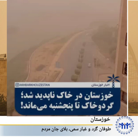 باتوجە بە تصاویر دریافتی در مرکز خبری KMMK، پنج شنبە ۲۷ فروردین ۱۴۰۴ استان خوزستان بار دیگر صحنه‌ی فاجعه‌ای زیست‌محیطی شده است. طوفان‌های گرد و غبار آلوده، که گفته می‌شود منشأ آن‌ها از جنوب عراق است، نفس مردم این استان را بند آورده است. این گرد و غبار حاوی خاک‌های آلوده به مواد شیمیایی و سمی بوده و بسیاری از شهروندان را راهی مراکز درمانی کرده است.