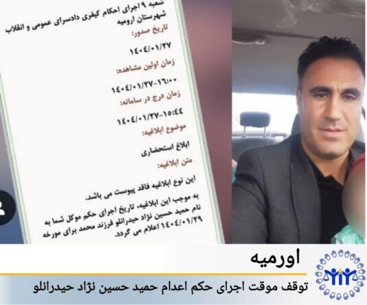 بر اساس گزارش مرکز خبری KMMK، جمعە ۲۹ فروردین ۱۴۰۴، یکی از برادران زندانی محکوم بە اعدام، حمید حسین نژاد حیدرانلو بە زندان رژیم ایران در اورمیە فراخواندە شد و از سوی مسئولین زندان بە وی اعلام شدە است کە حکم این زندانی سیاسی موقتا بە دستور دادستان، متوقف شدەاست.