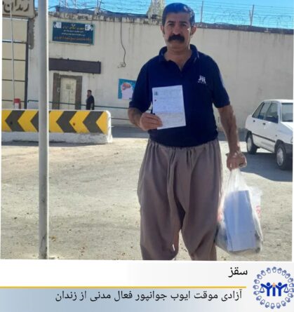 بر اساس گزارش مرکز خبری KMMK، سەشنبە ۶ آبان ماە ۱۴۰۴ خورشیدی، ایوب جوانپور فعال مدنی اهل سقز با قرار وثیقە بە صورت موقت از زندان رژیم ایران در این شهر، آزاد شد.
