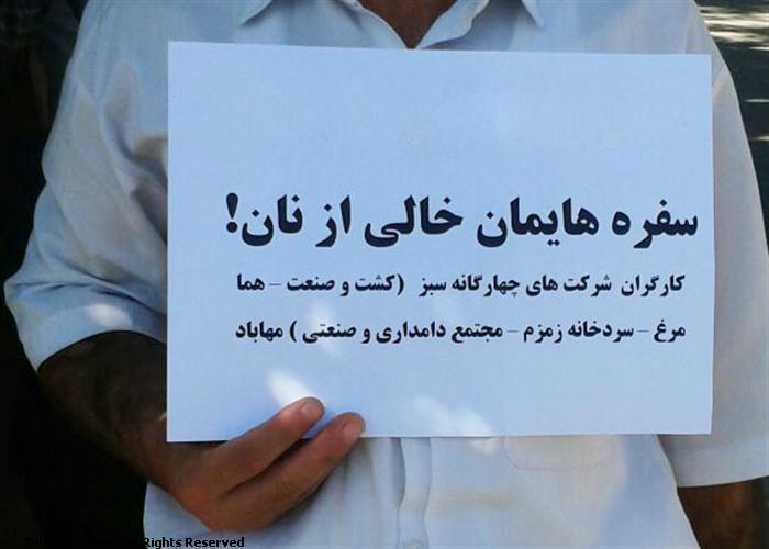 به گزارش جمعیت حقوق بشر کوردستان کارگران مجتمع کشت و صنعت مهاباد در حال حاضر بیش از بیست وهشت روز است که مقابل درب اصلی این مجتمع و کنار جاده اصلی چادر زده‌اند و به اعتراض خود ادامه داده اند.