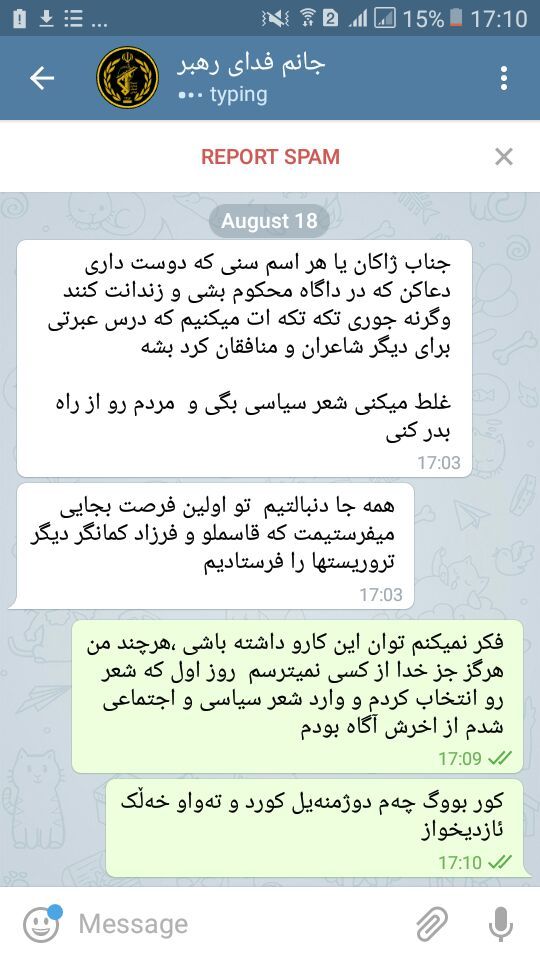 لەنوێترین هەڕەشەی کە کراوەتە سەرم بەشێوەی ڕاستەوخۆ لە ڕێگەی یەکێک لە خزمەکانمەوە کە بۆخۆیشی ئەندامی یەکێک لە دامەزراوە ئەمنییەکانە ؛ بانگهێشت کراوە و داوایان لێکردووە کەبەبنەماڵە ڕابگەیەنێ ،ئەگەر دەست لە چالاکییەکانم هەڵنەگرم ، ئەوان تاقەتی هەڵکردن لەگەڵئەم دۆخەیان نییە ونەتەنیا هەڕەشەی مردنیان لێکردووم بەڵکوو بنەماڵەکەیشم بەتاوانی هاریکاری من ، داگایی وزیندانی دەکرێن.( شیاوی کوتنە کەئەمە یەکەمجار نییە کەئەم کەسە بانگهێشت و داوای لێدەکەن لەمەڕ خزمایەتیمان وڵام بداتەوە؛ هەربۆیە ئەوانیش لەخزمایەتیان لەگەڵ من و بنەماڵەکەم خۆیان بواردووە(خوازیاری دادوەریم خۆ بێ ئایینیم هەڵنەبژاردووە) وپاش گەیاندنی پەیامەکەی ئەم مژارەی خستە بەرباس کە ئیدی پێوەندی خۆی لەگەڵ بنەماڵەم دەپسێنێ)