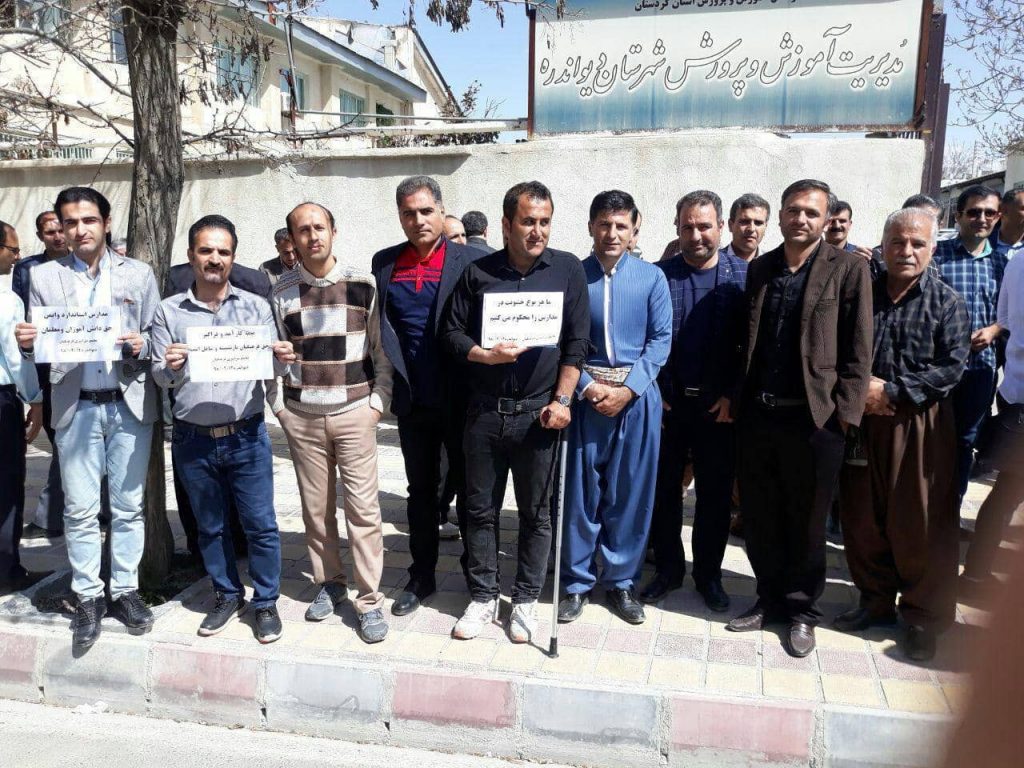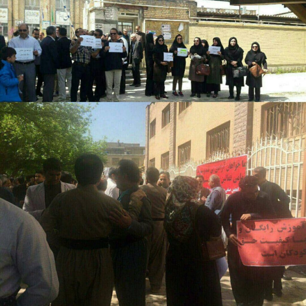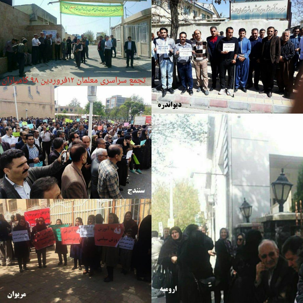 بە پێی راپۆرتەکە: مامۆستایانی خوێندنگەکان لە شارەکانی سنە، ورمێ، کرماشان، مەریوان، دیواندەڕە، سەقز و کامێران و شارەکانی تری رۆژهەڵاتی کوردستان لە بەردەم ئیدارەی پەروەردەی کۆماری ئیسلامی لەم شارانە کۆبونەوە.
